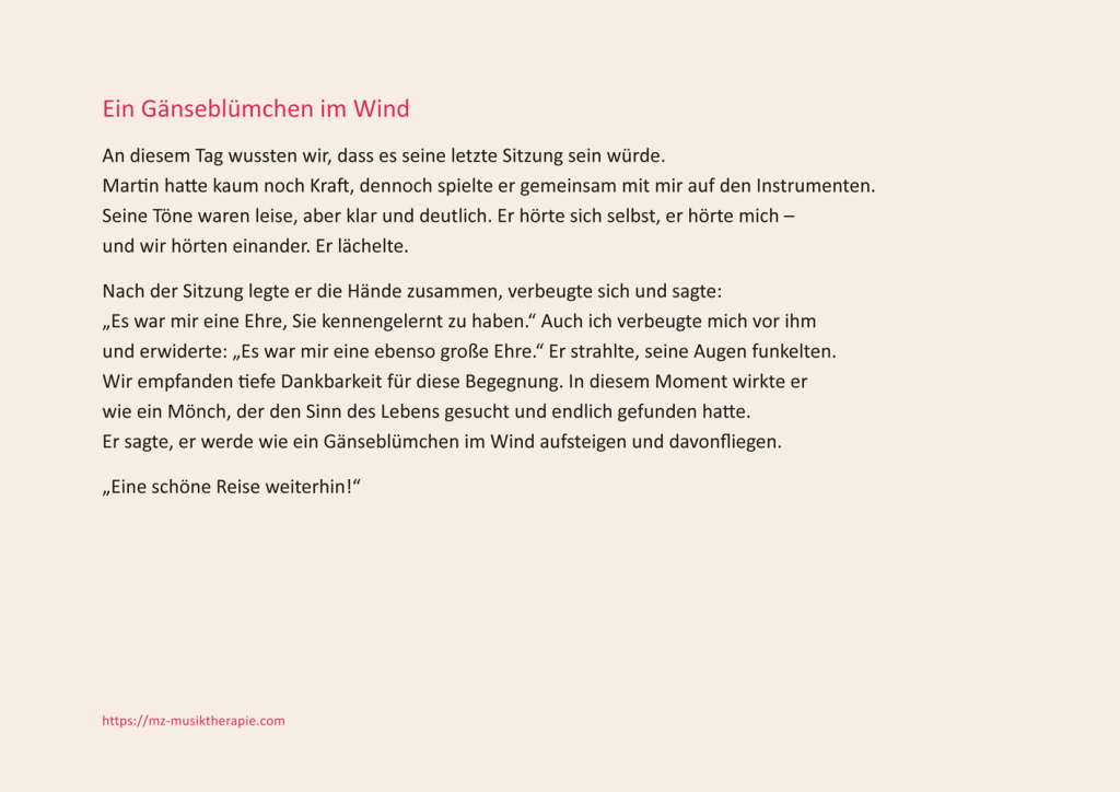 In einer Musiktherapie-Stunde beginnen wir oft mit mehreren Liedern und Klängen. Dann lasse ich nach und nach immer mehr Töne weg. Am Ende bleiben nur einige essentielle Klänge – solche, die wir Menschen alle gemeinsam haben und intuitiv verstehen, egal woher wir kommen.